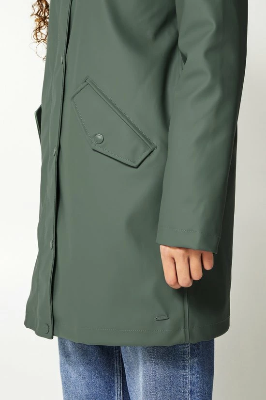 America Today dames regenjas. De Janice teddy is een lange regenjas met capuchon ideaal voor op de fiets. De capuchon kan doormiddel van een trekkoord aangetrokken worden voor extra bescherming. Daarnaast is de regenjas voorzien van een rits- en drukknoopsluiting en twee steekzakken met drukknoopsluiting. De teddy binnenstof houd je lekker warm tijdens de koude regen dagen.