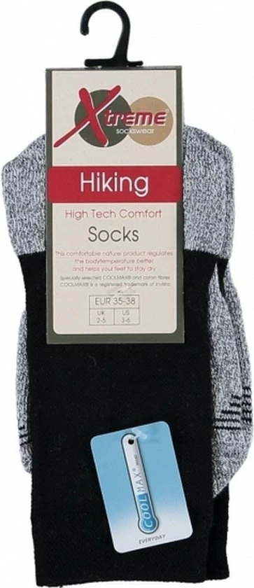 Zwarte wandelsokken dames maat 39/42. Lange hiking sokken voor dames. Deze Coolmax wandelsokken kunnen het hele jaar gedragen worden dankzij de lange hals. Het anatomisch gevormde voetbed zorgt voor een optimaal comfort tijdens wandelingen en het Coolmax systeem houdt de voeten koel, voor een optimaal klimaat. De sokken zijn handgeketteld en hebben dus geen voelbare teennaad. Ook hebben deze sokken een versterkte teen en hiel voor een langere gebruiksduur.