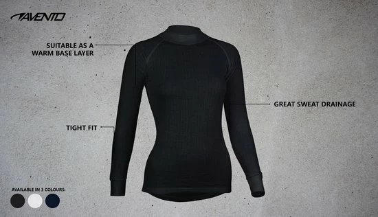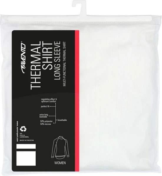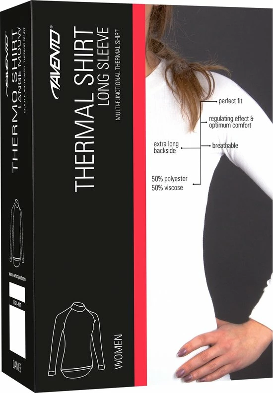 Avento thermoshirt voor dames met lange mouwen voor extra goede bescherming tegen de kou. Of je nu veel buiten werkt, wandelt of sport, met deze basislaag zorg je er voor dat je warm blijft. Door de combinatie van de duurzame, comfortabele stof en lange mouwen is deze thermokleding uitermate geschikt voor buitenactiviteiten in koude weersomstandigheden. De drop-needle textuur van de stof zorgt er voor dat het transpiratievocht razendsnel naar buiten wordt afgevoerd waardoor je lichaam droog en warm blijft.