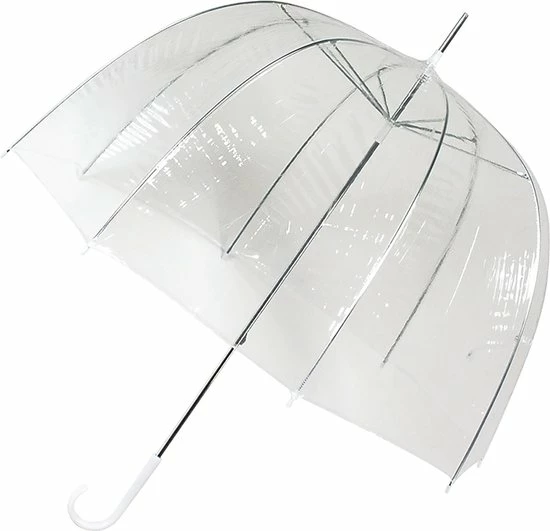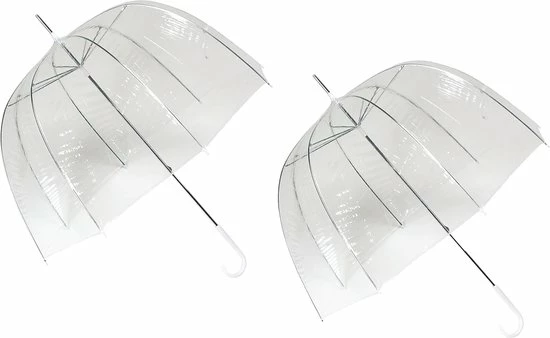 2x Transparante koepelparaplu. Een koepelparaplu in doorzichtige uitvoering. Diameter paraplu is ongeveer 75 cm. U ontvangt 2 stuks. Transparante paraplu’s zijn geschikt voor normaal gebruik. Daarnaast zijn deze paraplu’s zeer populair als trouw- of bruidsparaplu. Het witte handvat van de koepelparaplu heeft de vorm van een haak.