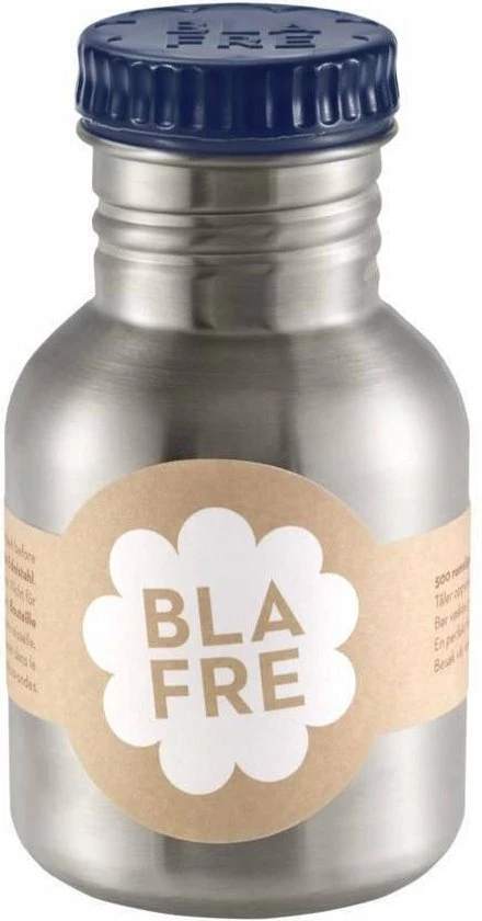 Kleine navy blauwe Blafre drinkbus in rvs, met een inhoud van 300 ml en draaidop. Deze praktische drinkfles is makkelijk te openen, te sluiten en lekt niet. De drinkbus mag in de vaatwasser.