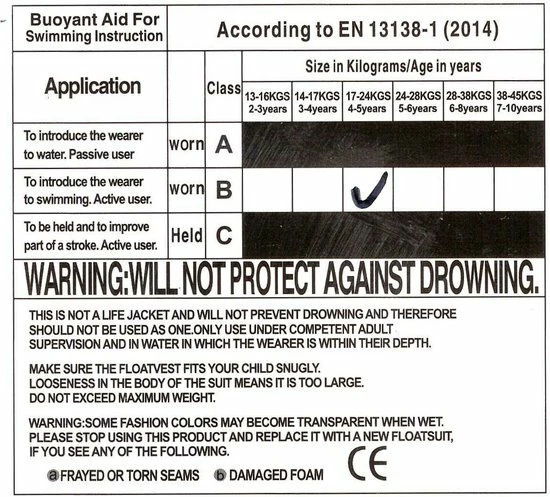 Het EasySwim Pro drijfpakje is een zwemhulpmiddel en géén reddingsmiddel. Kinderen moeten trappelen in het water om boven te blijven. Door te trappelen kan je kind drijven en spelenderwijs leren zwemmen. Indien nodig zul je je kind moeten ondersteunen, totdat hij/zij geleerd heeft om zelfstandig te blijven drijven. Blijf ook dan àltijd binnen een armlengte van je kind!