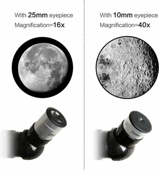 De sterrenkijker is uitgerust met 3X Barlow len en twee oculairs, H20mm en H6mm met een vergroting van 15X tot 150X. Of het nu gaat om het kijken naar sterren of manen, ‘s nachts of ovederdag, de telesocop zal u altijd iets weten te vinden.