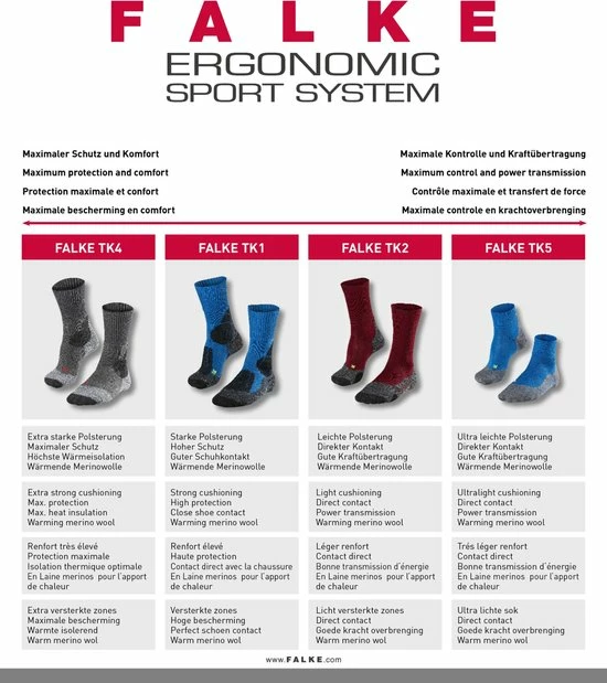 Unieke FALKE kwaliteit: Wij stellen de hoogste eisen aan wat uw lichaam beschermt en verwarmt. FALKE: traditioneel bedrijf en de hoogste kwaliteit sinds 1895. Genderspecifieke proporties dankzij speciale breiprocessen en cilinders; anatomische L/R pasvorm met teen- en zoolgedeelte aangepast aan elke voet, een FALKE innovatie die zorgt voor een kreukvrije pasvorm, bescherming tegen drukpunten en een langere levensduur.
