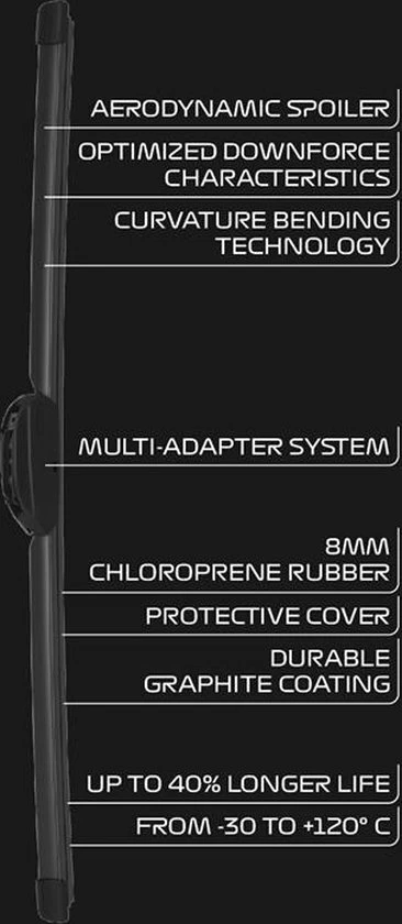 Formula 1® Ruitenwissers zijn speciaal ontworpen voor let leveren van maximale wisprestaties, ook tijdens het rijden met hoge snelheden. De contactdruk van de ruitenwissers wordt nog verder geoptimaliseerd door de geïntegreerde hogesnelheidsspoiler. Dit zorgt voor efficiënte en gelijkmatige veegprestaties (ook bij harde wind) en een perfect streeploos resultaat in alle weersomstandigheden (-30 tot +120° C).