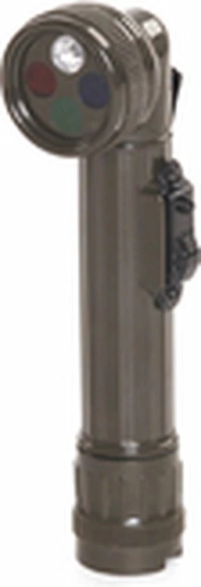 Praktische zaklamp, te bevestigen met een clip aan bijv. borstzak. Lamp werkt op 2 AA-cel batterijen (niet meegeleverd). In de verstelbare kop zitten 4 verschillende kleuren filters.