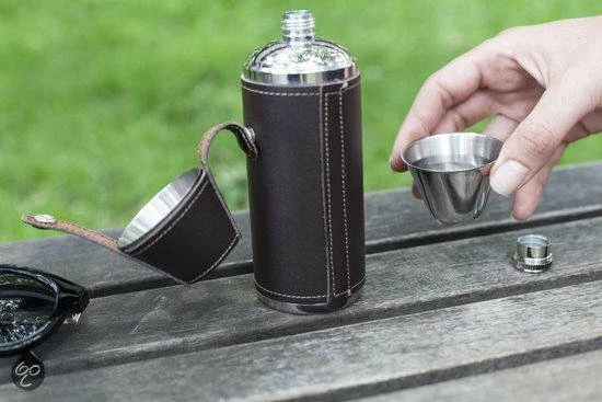 De Kikkerland drink fles komt met 2 shot glaasjes en leren omhulsel om alles bij elkaar te houden.