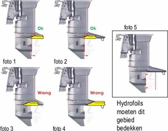 De hydrofoil trimvlakken zijn makkelijk te installeren en worden geleverd met RVS schroeven voor bevestiging. De standaard plaats voor de trimvlakken is direct boven de schroef. Elke buitenboordmotor heeft ingebouwde stabilisatoren. Die zijn echter veelal te klein om het gewenste resultaat op te leveren. Idealiter monteer je de hydrofoil een aantal centimeter boven de schroef (zie de tweede afbeelding) zodanig dat de schroef volledig ‘bedekt’ wordt. Monteer je de hydrofoil te hoog, te ver naar voren of te ver naar achteren dan verliest de hydrofoil zijn werking. Bij de juiste installatie wordt het schroefwater tegen de hydrofoil gedrukt waardoor een betere trim ontstaat.
