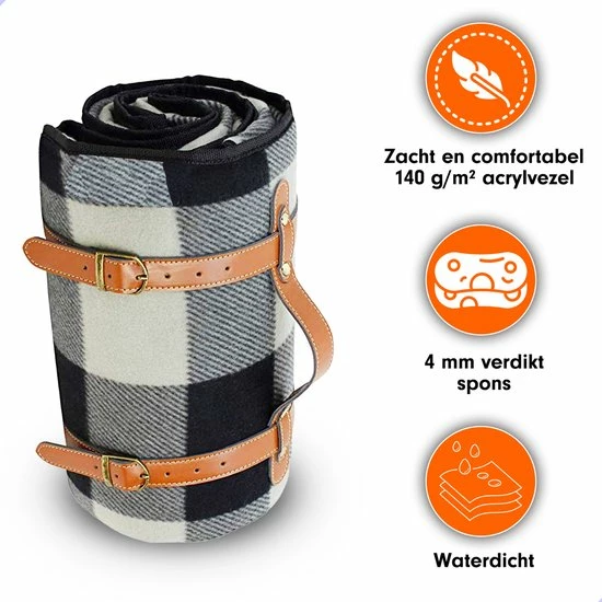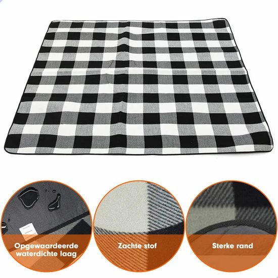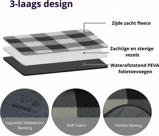 Het kleed bestaat uit drie verschillende lagen. De bovenkant is gemaakt van zijdezacht fleece en is extreem comfortabel om op te zitten en liggen. Middenin is hij opgevuld met vezels wat hem steviger en tevens zachter maakt. De onderkant van het picknickkleed is afgewerkt met een isolerende, waterdichte- en waterafstotende aluminium laag. Tevens stoot de onderkant zand en vuil af, zo is het kleed dus gemakkelijk schoon te houden!