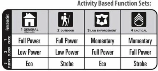 Een nieuwe en handige eigenschap is dat je kunt kiezen uit vier verschillende programma’s waardooor je de bediening kunt afstemmen op je gebruik en functie. Er is een algemene instelling, een outdoor, een Politie en een tactische instelling waardoor je kan schakelen tussen diverse lichtstanden maar ook tussen de SOS en een stroboscoop.