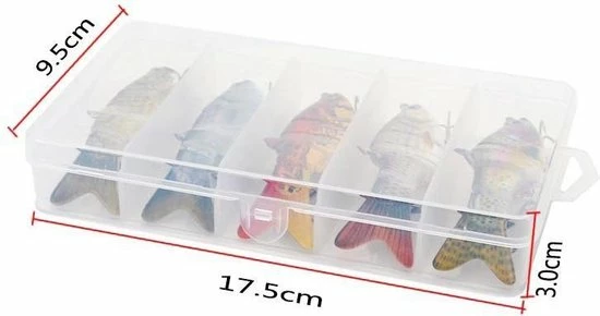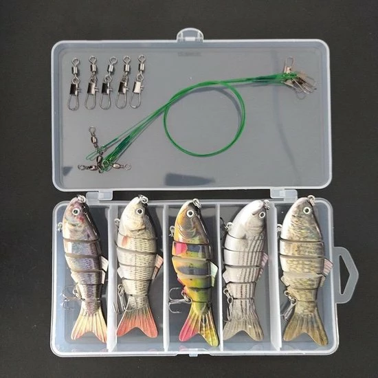 Wil je gemakkelijk vissen vangen? Dan is deze set de perfecte keuze voor jou! Deze set bevat 5 verschillende kunstazen en 4 onderlijnen. De kunstazen hebben zowel lichte als donkere kleuren. Donkere kleuren kunnen het best worden gebruikt in helder water en de lichte kleuren werken het best in troebele water. De kunstaas bestaat uit zesdelige lichaam, daardoor gaat het heel realistisch door het water heen. Het is dus perfect voor de grote snoek en baarzen. De gehele set wordt geleverd in een handige opbergdoos.