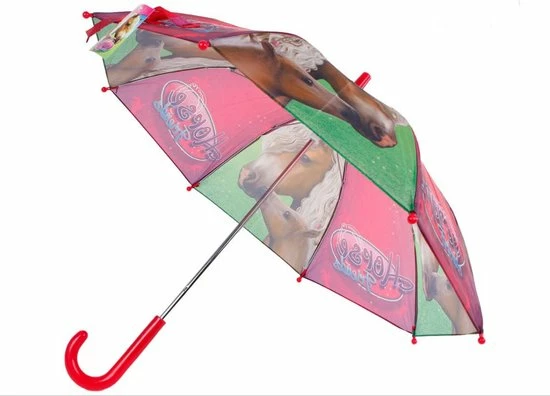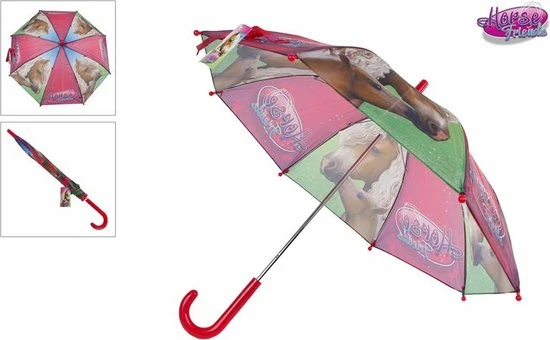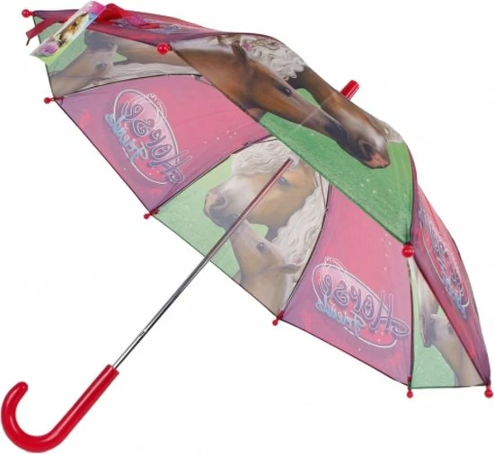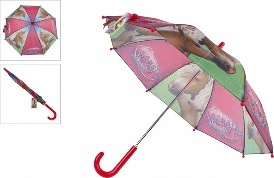 Kinderparaplu horse friends. Deze paraplu is gemaakt van polyester en kunststof. De diameter uitgeklapt is 70 cm en de hoogte van deze paardenparaplu is 60 cm.