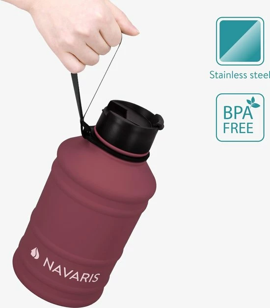Deze XL waterfles van Navaris is dankzij z’n grote inhoud ideaal voor onderweg, in de sportschool of op reis. Hij is keer op keer herbruikbaar en dus een milieuvriendelijke keuze.