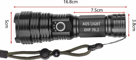 Verpakkingsinhoud: zaklamp, usb oplaadsnoer, 220v oplader, accu 26650 5200mah, polskoord, adapter voor 3 aaa batterijen, gebruiksaanwijzing nederlands.