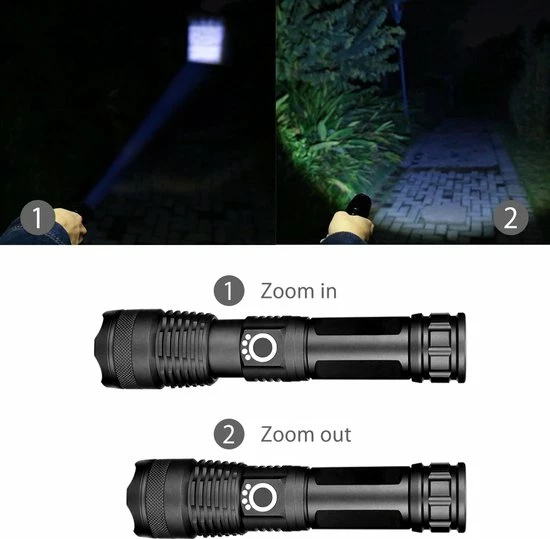 Meegeleverd wordt: een krachtige 26650 5000 mAh rechargeable batterij, een usb oplaadsnoer en een 220v usb oplader.