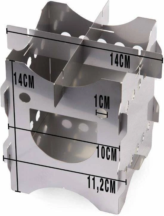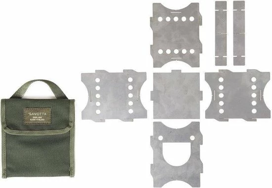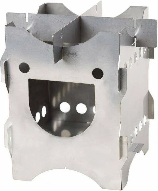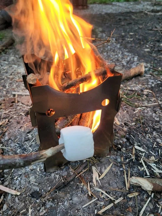 Deze altijd blij kijkende stove is geheel plat op te bergen en snel in elkaar te zetten. Hij bestaat uit 7 metalen plaatjes welke samen de stove vormen. Compleet met sterk 1000D cordura opbergtasje.