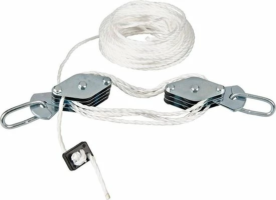 Deze katrol set heeft 19.8 meter koord dat over 2 stalen, zink gecoate runners loopt. Hierdoor kunt u tot 180 kg. hijsen, met een 6:1 mechanisch voordeel. De maximale takelhoogte van de katrol is 3.1 meter.