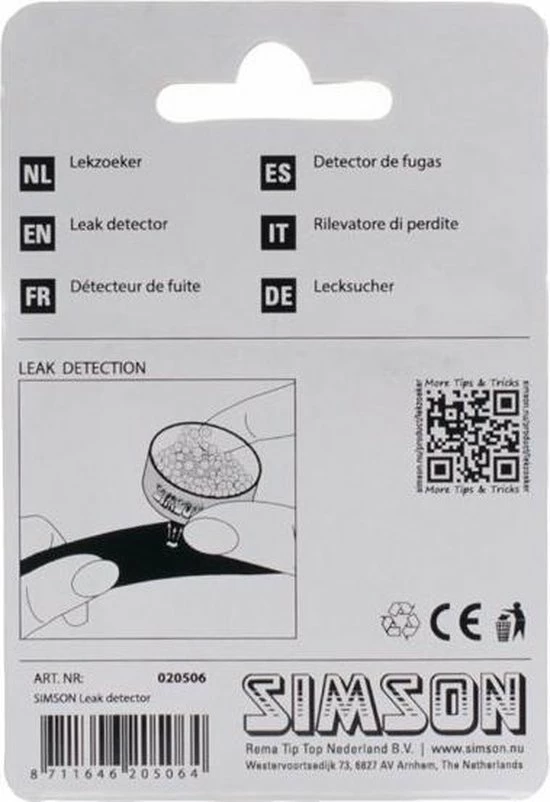De Simson lekzoeker is een handige tool om snel het gat in de band te vinden, zonder het gebruik van water. Door zijn compacte formaat is de lekzoeker ook handig voor onderweg. Beweeg met de lekzoeker over de binnenband, en de piepschuimen balletjes komen in beweging door de luchtstroom bij lekkage. Specificaties: Geen water nodig Compact Handig voor onderweg