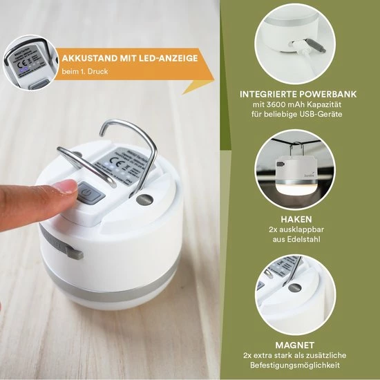 - ✔ OPLAADBARE POWERBANK: De moderne LED-lamp met een verlichtingstijd van 110 uur werkt zonder milieubelastende batterijen en kan worden opgeladen met de USB-kabel. De 3600 mAh batterij kan ook worden gebruikt als een powerbank voor tablet/mobiele telefoon.