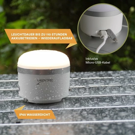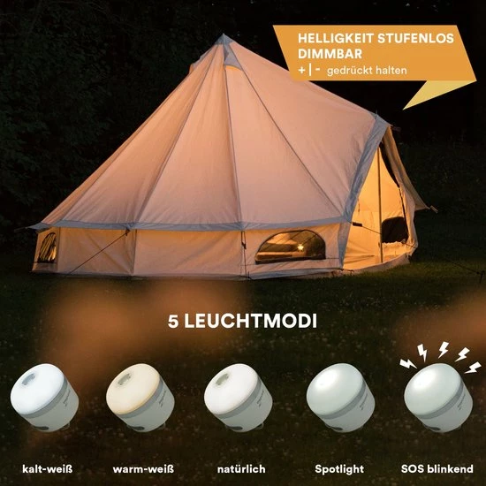 - ✔ VEELZIJDIGE CAMPINGLAMP: De handige Skandika Tarfala camping lamp is uitgerust voor alle situaties met 5 lichtstanden. Deze omvatten 3 verschillende kleurtemperaturen, een spotlight-stand voor gebruik als zaklamp en de SOS-stand voor noodgevallen.