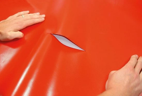 6. Breng het vrijgemaakte stuk Tear-Aid aan op de scheur. Verwijder de rest van