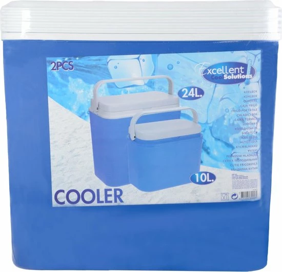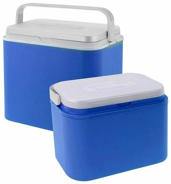 Deze koelboxset is vervaardigd van kunststof en bestaat uit 2 koelboxen. Deze koelboxset is heel handig voor een dagje naar het strand, de camping of gewoon in de tuin. De grote koelbox heeft een inhoud van 24- en de kleine een van 10 l. Deze passen heel goed in elkaar, dus opgeruimd nemen ze minder ruimte in beslag. Je kunt de grote voor dranken gebruiken en de kleine voor hapjes en fruit, jij bepaalt dat zelf!