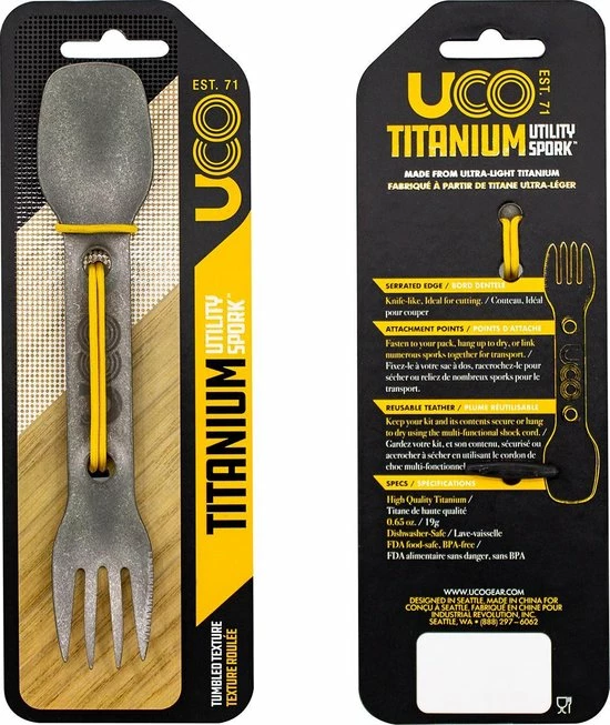 Met deze lichtgewicht Titanium Spork Ultimate van het gerenommeerde outdoormerk Uco heeft u altijd ál het benodigde binnen handbereik! Deze onverwoestbare roestvrijstalen Spork is geschikt voor op de camping, tijdens survival, trektochten, sportvissen, vakanties en alle andere outdoor activiteiten.
