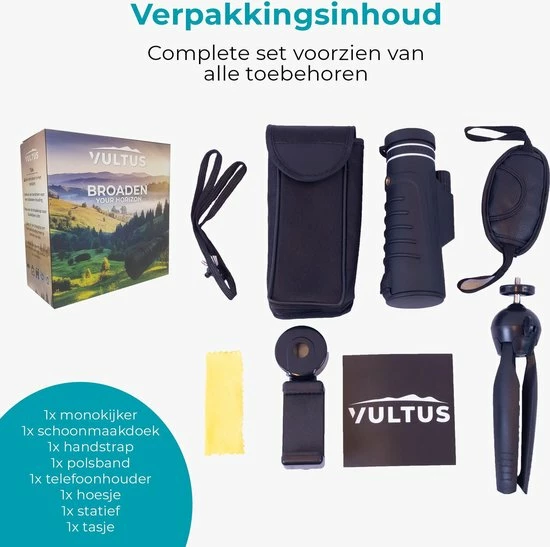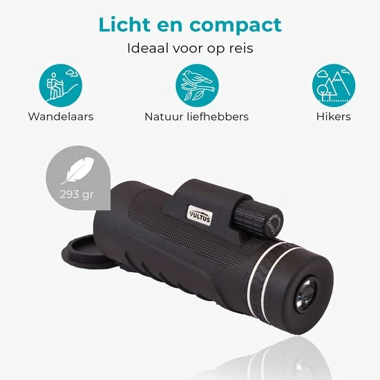 De monokijker komt met een stevige draagtas en een comfortabel nekkoord. Zo kun je hem snel inpakken en meenemen! Dit maakt deze monokijker perfect voor reizen en lange wandeltochten. Daarnaast is deze Vultus Explora erg eenvoudig op te bergen, wat hem ideaal maakt om hem bijvoorbeeld in je achterzak te steken.